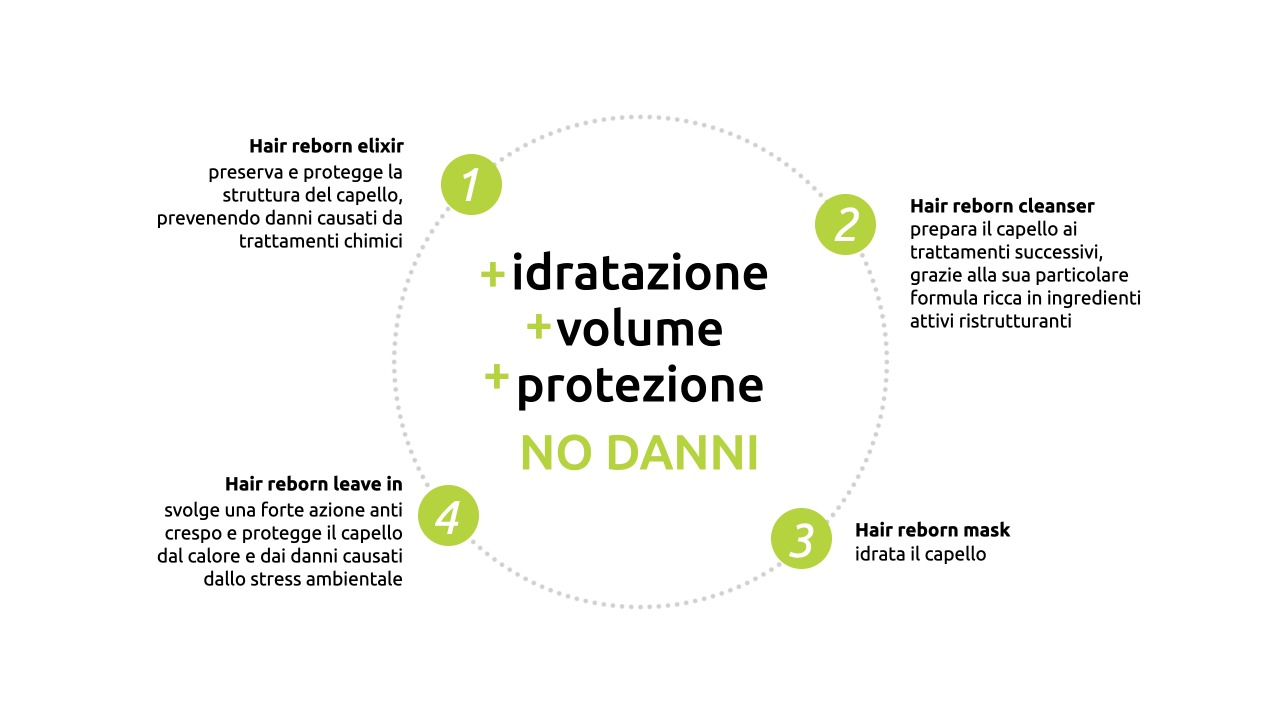3 Hair reborn leave-inCome ultimo step, prima e dopo la piega applicare, sui capelli tamponati, HAIR REBORN LEAVE-IN.